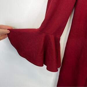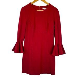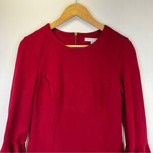 Trina Turk Panache Mini Dress in red. Made from structured ponte fabric, this hourglass silhouette features long sleeves, a classic crew neckline, and a hidden back zipper with hook-and-eye closure for a seamless fit. Fully lined for comfort, the dress is finished with charming ruffled cuffs that add a touch of playful elegance to its polished look.