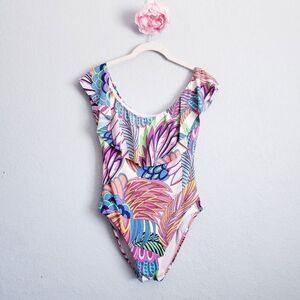 Vibrant off-shoulder design. Features multicolor feather pattern. Perfect for beach or pool.