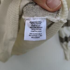 Features: a soft merino wool jacket with metallic threads making a sunburst pattern. Ribbed hem and cuffs. Pullover styling. Dolman sleeves, accented pilling. Long sleeve. Cream, white, ivory, gold, silver, metal. Crew neck.