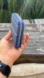 Stylish wallet with a blue and white geometric pattern. Features a gold zipper.