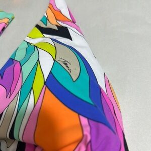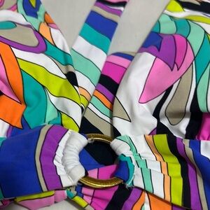 Dive into summer with the Trina Turk Pink and Blue Halter Bikini, featuring a chic geometric pattern. This stylish bikini offers a vibrant look with its bold colors and artistic design, perfect for making a statement at the beach or pool.