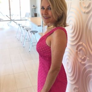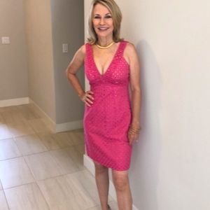 Adorable dress with a cut to flatter all shapes and sizes. The actual color is more of a light, muted fuschia than the bright pink in the photos. Size 4 but runs slightly smaller. Hidden long back zip. Has a pretty trim under bust & on straps. Center of band beneath bust is 14 1/2". Length about 35". Hips about 18". So, so cute and in great condition. It's eye catching. You'll love it, especially if you don't mind showing a little cleavage.