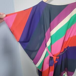 Bold multicolor diagonal stripes with short kimono sleeves and matching tie belt. Lightweight and silky — great for beach, vacation, or summer outings.