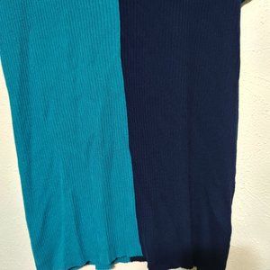 Vertical color-blocking; Turquoise on one side, Dark Navy Blue on other