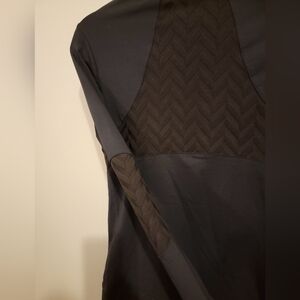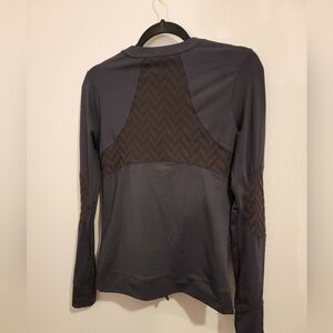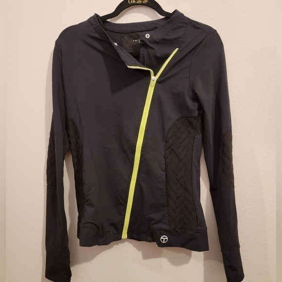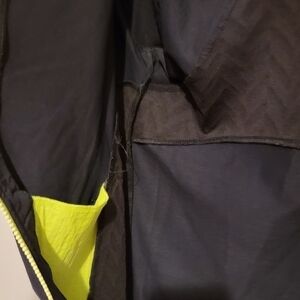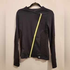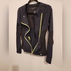 Black and Neon Yellow zip up lightweight running jacket athletic stretch material with elbow and back material being the chevron print flex material. Feels Neoprene and moisture wicking. Sharp jacket with diagonal neon zipper. Inside pockets and pockets on the outside. Like new condition! Size XS!