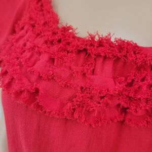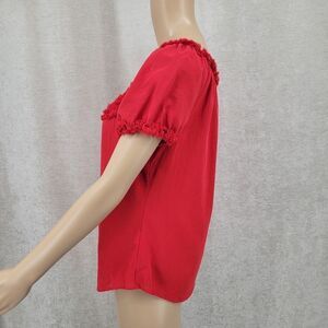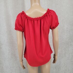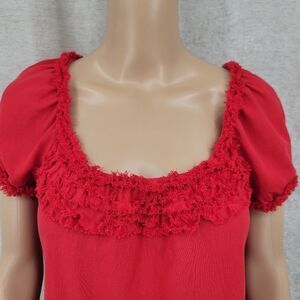 Red short sleeve top with deep U neckline, distressed puffy trim at chest, and sleeve openings. Lightweight breathable fabric is perfect for summer and fall. No flaws or visible wear.