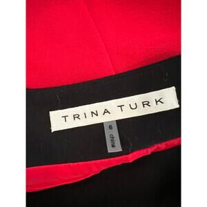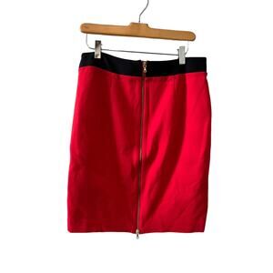 Trina Turk Red Pencil Skirt Gold Back Zipper Detail, size 6. Rayon nylon spandex blend. Fully lined with red lace detail at hem of lining. Very good preowned condition. Lovely feminine skirt, Perfect for the holidays or for the office!
