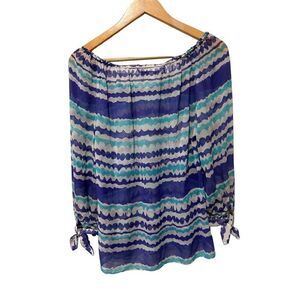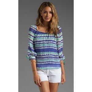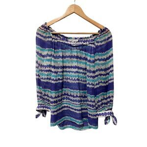 Trina Turk Revolve Blue Bird Cool Scoop Neck Striped Sheer Blouse Tie Wrists M $209 retail Coastal Beachy