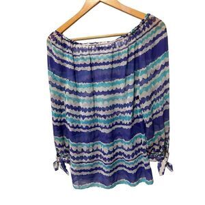 Trina Turk Revolve 100% Silk Blue Bird Cool Coastal Sheer Blouse Tie Sleeve M
