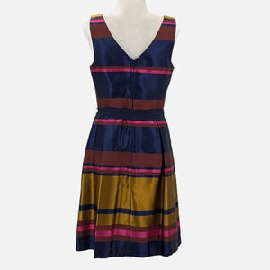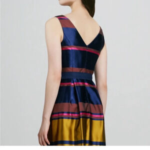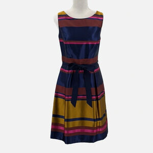 Trina Turk Sabra Shantung Sleeveless Dress in Stripes - Size 6. Excellent, like new condition. I think it's new without tags. Zero signs of wear or cleaning. Boat neckline, V neck back, sleeveless, hidden zip closure, lined with a lace edging at lining hem, belted at waist with a grosgrain ribbon tie (included), pleating on skirt. Shiny stripes in blue, pink and gold. There is one other color but I am stumped as to what color it is. It's a mix between brown, burgundy and bronze. Gorgeous dress, perfect for the upcoming holiday party season. Approximate measurements: 16 1/2" pit to pit, 14 1/2" waist, 36" length.