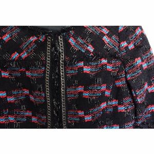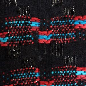 Only worn a few times. Red, blue, and black tweed with silver metallic threading. Short fringed edges and chain trim detail along front. 4 clasps to close. 2 small pockets on the front. One small stain on the back (last picture) but I haven't tried to remove it. Otherwise perfect condition. Shell: 61% rayon, 19% nylon, 15% silk, 2% polyester, 2% metallic, 1% cotton. Lining: 100% acetate. Dry clean only.