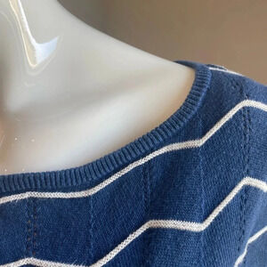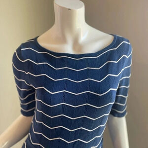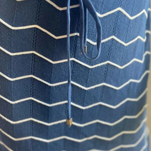Trina Turk sweater knit Serena chevron blue and white dress. Good condition. No snags or stains noted. Approximate measurements. No size tag noted fits like a small on mannequin. Detailed knitting pattern refer to pictures