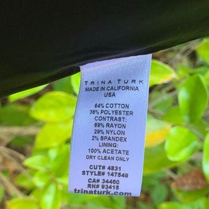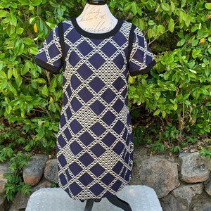 Trina Turk sheath dress. Navy base color with black and white pattern, and black trim. Very sophisticated.