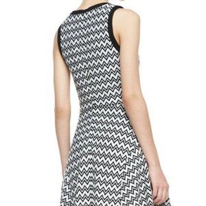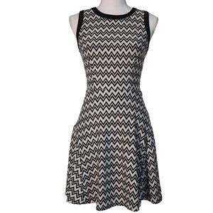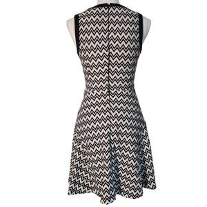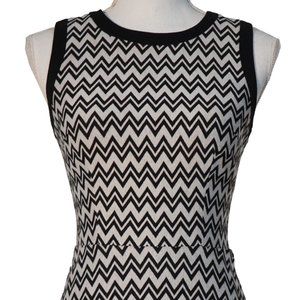 The dress has a hidden zipper in the back, a rounded neckline, and a slight flair to below the waist. The dress features an all-over black and white chevron/zigzag print and is trimmed in solid black around the arm openings and neckline.