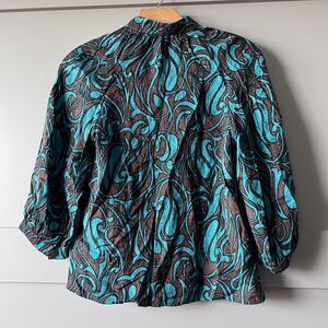 Trina Turk Shirt Womens Petite XS Brown Teal Silk Jacquard Button Blouse 3/4 Sleeve