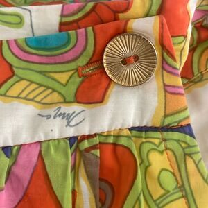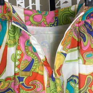 Additional Details: Bright 60's inspired print, hidden back zip closure, fully lined, fully functional deep front pockets, pleated waistband, gold button accents on waistband.