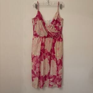 Trina Turk Silk Midi Dress Size 10 Pink White Floral Faux Wrap Adjustable Straps