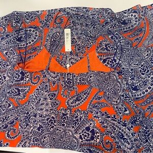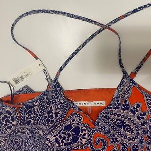 This sexy and flowy Trina Turk dress is the Trina Turk Alverta Paisley Print Silk Midi Dress. It’s a gorgeous blue and orange paisley, 100% Silk, lined in orange satin fabric. This dress can be dressed up or down, and is the ready-to-wear sundress. Pull over style with adjustable spaghetti straps. Womens size 2.