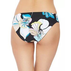 Allover floral print that reverses to solid black. Shirred sides. Moderate coverage. Lined.