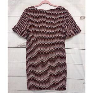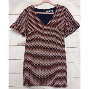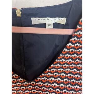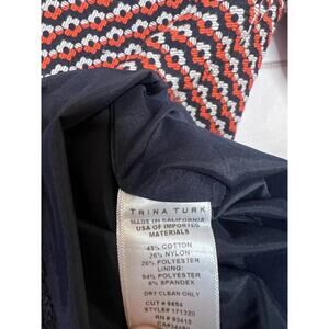 The Trina Turk Size 10 Dress in white, navy, and red floral pattern with ruffle sleeves is a stylish and colorful option for a party or cocktail event. This A-Line dress features a flattering V-neckline, short sleeves, and a zip closure for easy wear. The dress length is short, making it perfect for summer and spring seasons, and the blue accents add a touch of elegance to the overall flower theme. Made by the brand Trina Turk, this dress is a regular size fit for women who love trendy and feminine styles.