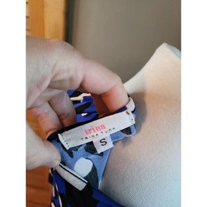 This stunning Trina Turk dress is perfect for any fashion-forward woman. With its beautiful blue animal print pattern and sleeveless design, it's sure to turn heads. Made with a polyester spandex blend for a stretchy, comfortable fit. Size small and smoke free. 33 inches in length and 16 inches from armpit to armpit.