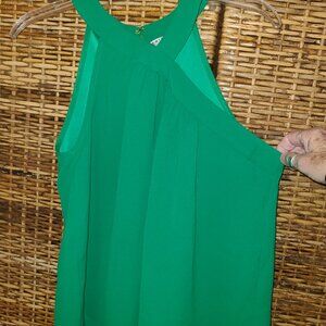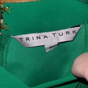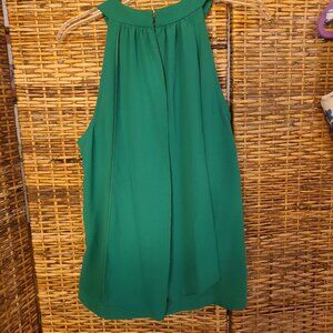 The Trina Turk Sleeveless Blouse in size L features an offset neckline with an attached scarf on the back, making it a stylish and versatile piece for various occasions. The blouse is made of polyester fabric and has a V-neckline and back zipper closure. The green color and solid pattern add a touch of elegance, while the halter strap and sleeveless design offer a chic and comfortable fit. Ideal for travel, weddings, parties, casual outings, and workwear, this blouse combines sophistication with a city chic theme, perfect for all seasons. Made in the United States, this blouse is a must-have for women's wardrobes. Size large. It measures 19" across the front at the underarms. Total length down the center of the back is 25 3/4". In great condition. Very unusual and chic style.