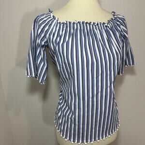 Trina Turk Small Top Sleeveless Blouse Blue Striped Preppy Coastal Poms Coastal