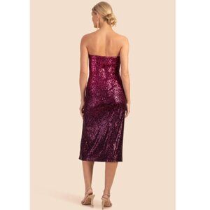 Trina Turk 'Stella' sequin cocktail dress featuring a a bodycon silhouette, midi-length, high left slit, and shimmering sequins in an ombré gradient of fuchsia and plum.
