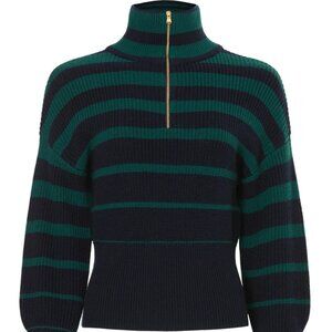 Rib knit zip-up pullover sweater. Wear as a turtleneck or open neck. Navy with green stripes. Great medium weight sweater option as we move into fall.
