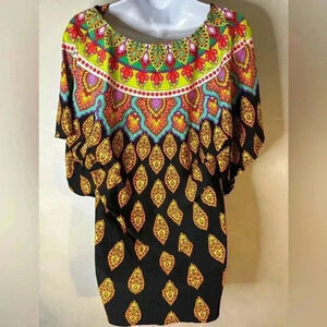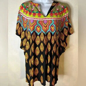 This stunning Trina Turk kaftan is perfect for a day at the beach or by the pool. The colorful medallion design and black background give it a Moroccan vibe, while the V-neck, batwing sleeves, and dolman cut make it chic and comfortable. Made of nylon and elastane, it features a relaxed fit that drapes beautifully. The cover-up can be easily hand washed and is perfect for all women looking for a stylish and practical piece.
