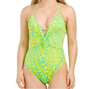 Trina Turk TRELLIS One Piece Aqua Yellow Swimsuit Twist Halter NWT $184 Sz 8
