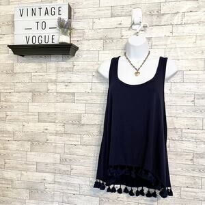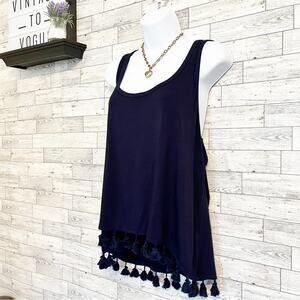 Introducing the Trina Turk Tajo Tassel Hem Jersey Navy Blue Tank in size XL. This boho-style tank has a scoop neck, racerback, and playful tassel trim hem. Made of stretchy 96% viscose and 4% elastane, it's machine washable.