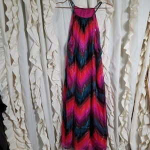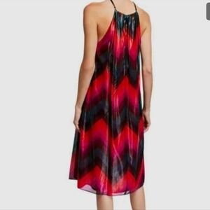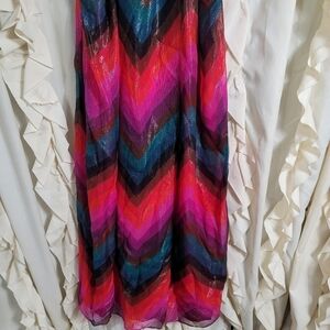 Trina Turk metallic chevron trapeze dress. Metal straps at shoulders. Chevron stripes in pink, red, blue and purple. Pleat at chest to create a trapeze style. Midi length. Great condition, no stains or holes.