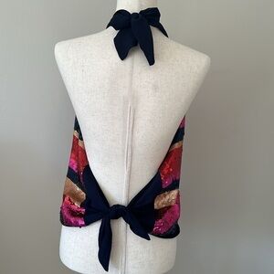 Trina Turk open back sequin halter top has bright and colorful stripes of pink, red, gold & blue. Ties at the back of the neck and bottom back. Size small.