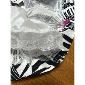 This strapless dress features a vibrant tropical print in black and fuchsia with a fitted silhouette and soft inner lining, offering style and comfort.
