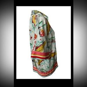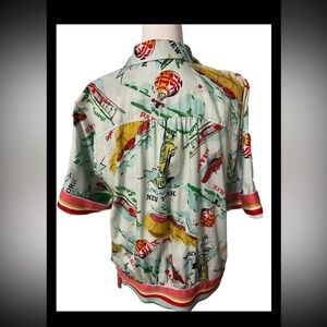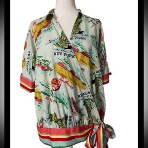 This fun novelty print Trina Turk wrap top features travel print, modesty snap at bust, side tie. 100% cotton for summer comfort. Missing one of two interior buttons Travel Casual Comfy