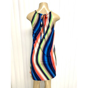 Trina Turk Tunic Dress Striped Multi Color Mini Sleeveless Tie Neck Line…