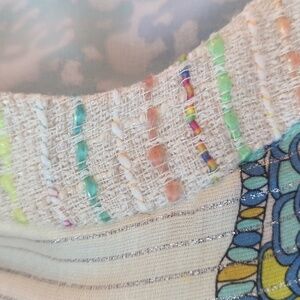 pretty pop print colors of green/ yellow/coral on ivory ground with subtle silver metallic verticle stripes