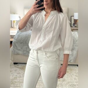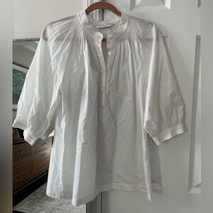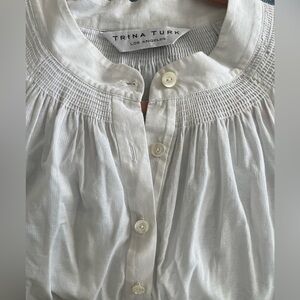 White half button down blouse with puffy sleeves by Trina Turk. Size and material tag have been cut. Material feels like light weight cotton. Fits like a size Medium. See measurements in photos. Very good condition.