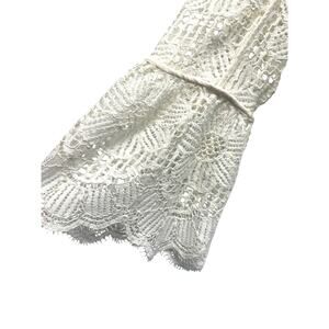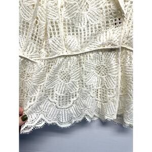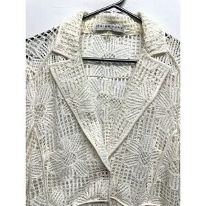 Elegant and feminine Trina Turk lace jacket in a beautiful ivory white. Features an intricate floral crochet lace overlay with a scalloped hem, structured blazer-style lapel collar, and romantic bell sleeves. Fully sheer design—perfect for layering over dresses, tanks, or camisoles for weddings, garden parties, or chic casual looks.