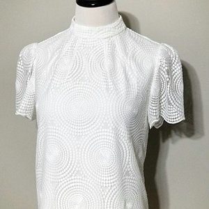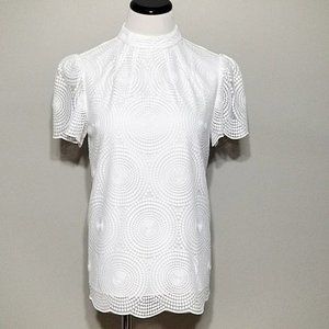 Trina Turk White Embroidered Mesh Top XS Short Puff Sleeve Blouse Mod Chic