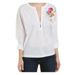 Trina Turk 17R109 White Floral Embroidery 3/4 Sleeve Split Neckline Tunic Blouse Medium