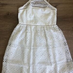 Size 12. NWT Trina Turk White Lace fully lined halter dress. This dress has a tag hanging on it, but I think it has been worn once. There is a very light stain on the liner, as pictured. Also, there appears to be some light discoloration at the inside of the halter top.