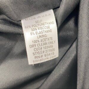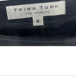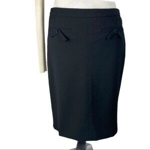 Trina Turk women's size 4 skirt, it has a front bow accent, back pleated accent, color is black, pencil style, knee length pencil style, lined with a back zip closure. Care dry clean only. Materials shel. 62% polyurethane, 33% viscose and 5% elastane, lining 100% viscose. Condition very good as shown in pictures. Please preview measurements to ensure fit