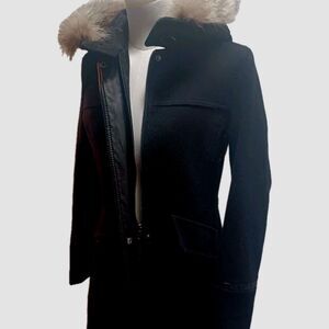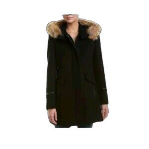 Trina Turk Women's Black Wool Blend Hooded Coat With Real Fur Trim Size 2