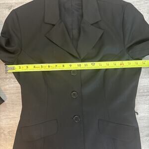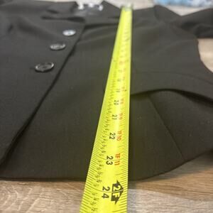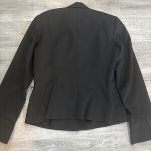 The Trina Turk Women's Blazer in size 8 is a stylish black suit jacket with a regular length and long sleeves. Made of polyester blended fabric, this blazer features a three-button sleeve button style and comes lined for added comfort. Perfect for a career-oriented look, this blazer from Trina Turk is a versatile piece that can be dressed up or down for any occasion.