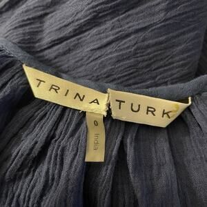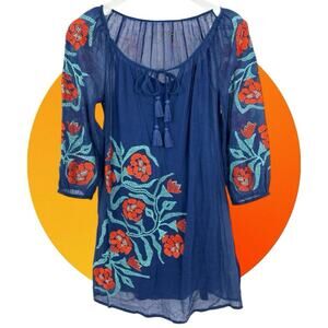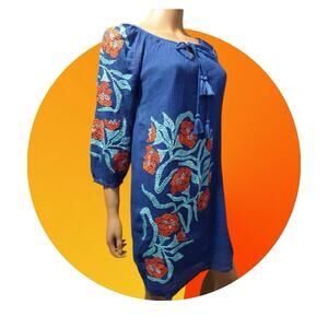 Trina Turk Women's Blue Red Embroidered All Cotton Gauze Shift Dress in size 0 an XS (also fits 00) is a stylish coverup perfect for various occasions such as sightseeing, pool coverup, casual errands dress. The dress features a solid medium blue with embroidered accents, a keyhole tied crew neck, and 3/4 sleeves with elastic cuffs. Made of lightweight cotton crinkle gauze this thigh length dress is in cotton lined and ideal for the summer, fall, and spring seasons. Lining is detachable. It’s a versatile and classic boho piece for any woman's tropical wardrobe.