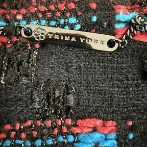 Trina Turk Womens Good Night Tweed Fringe Chain Jacket Black Red Blue Sz 10. Collarless lady jacket in CHANEL style. Gorgeous details: chain embellishment, fringe, fully lined, small front pockets, hook/eye closure. Excellent condition, may have some pulling but the fabric is originally this way!