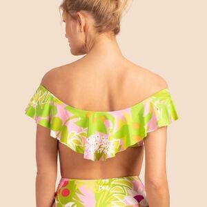 Fun and flouncy with a ruffled detail, this off-the-shoulder bikini top from Trina Turk features a colorful print.