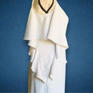 Description-Cold Shoulder, ruffles layered, back zipper closure, cascading ruffles down the sides. Lined.